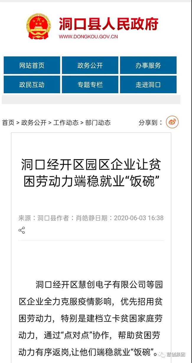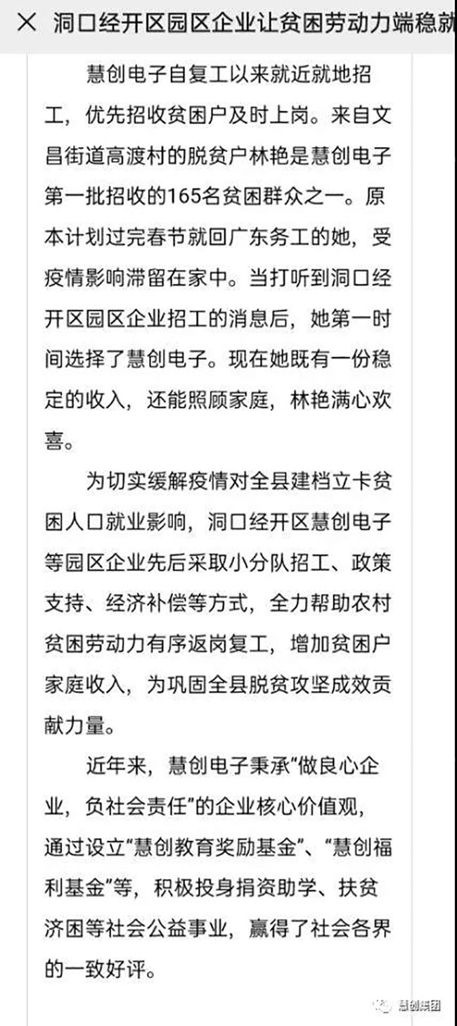 洞口慧創電子作為洞口縣首批復工復產企業,通過加大招聘力度及貧困勞動力輸入,為貧困勞動力提供就業崗位,大力推動貧困勞動力就近就地就業,并采取貧困勞動力就業補貼等措施,讓更多的貧困勞動力在家門口早日實現就業,增加收入,確保脫貧。